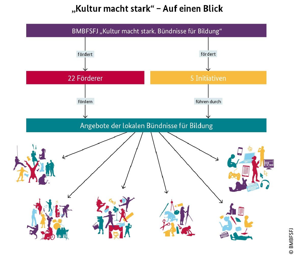 Das Bundesministerium für Bildung, Familie, Senioren, Frauen und Jugend (BMBFSFJ) arbeitet bei der Umsetzung des Programms „Kultur macht stark. Bündnisse für Bildung“ mit verschiedenen Verbänden und Stiftungen als Programmpartner zusammen.